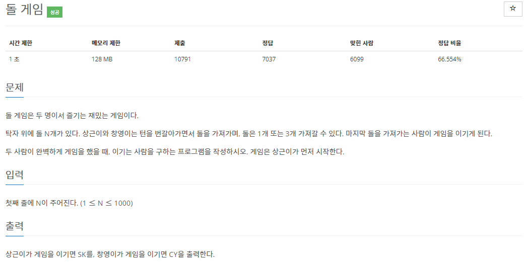 N이 홀수일때는 상근이 이기고, N이 짝수일 때는 창영이 이긴다는 규칙을 가지고 있다.